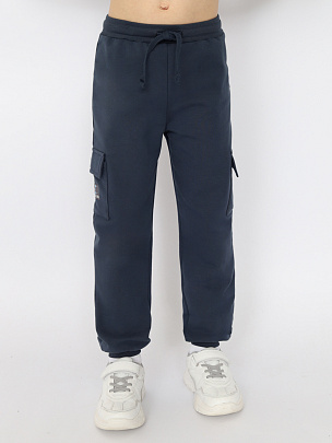 Брюки с карманами и притачным поясом из полотна с добавлением лайкры, в пояс вставлен функциональный шнур. Нижние срезы брюк обработаны притачными манжетами из полотна с эластаном. Карман брюк декорирован вязаной нашивкой.
